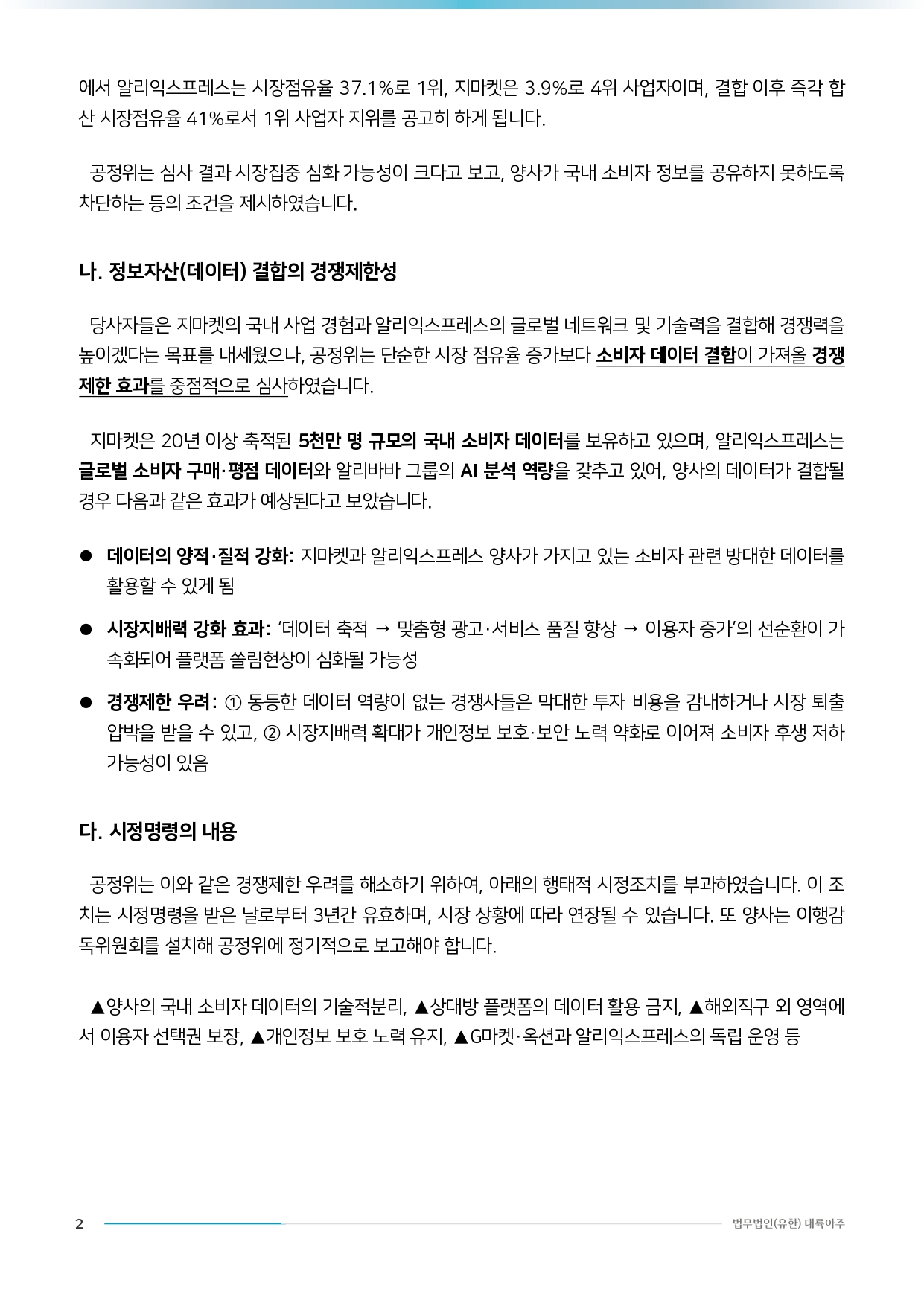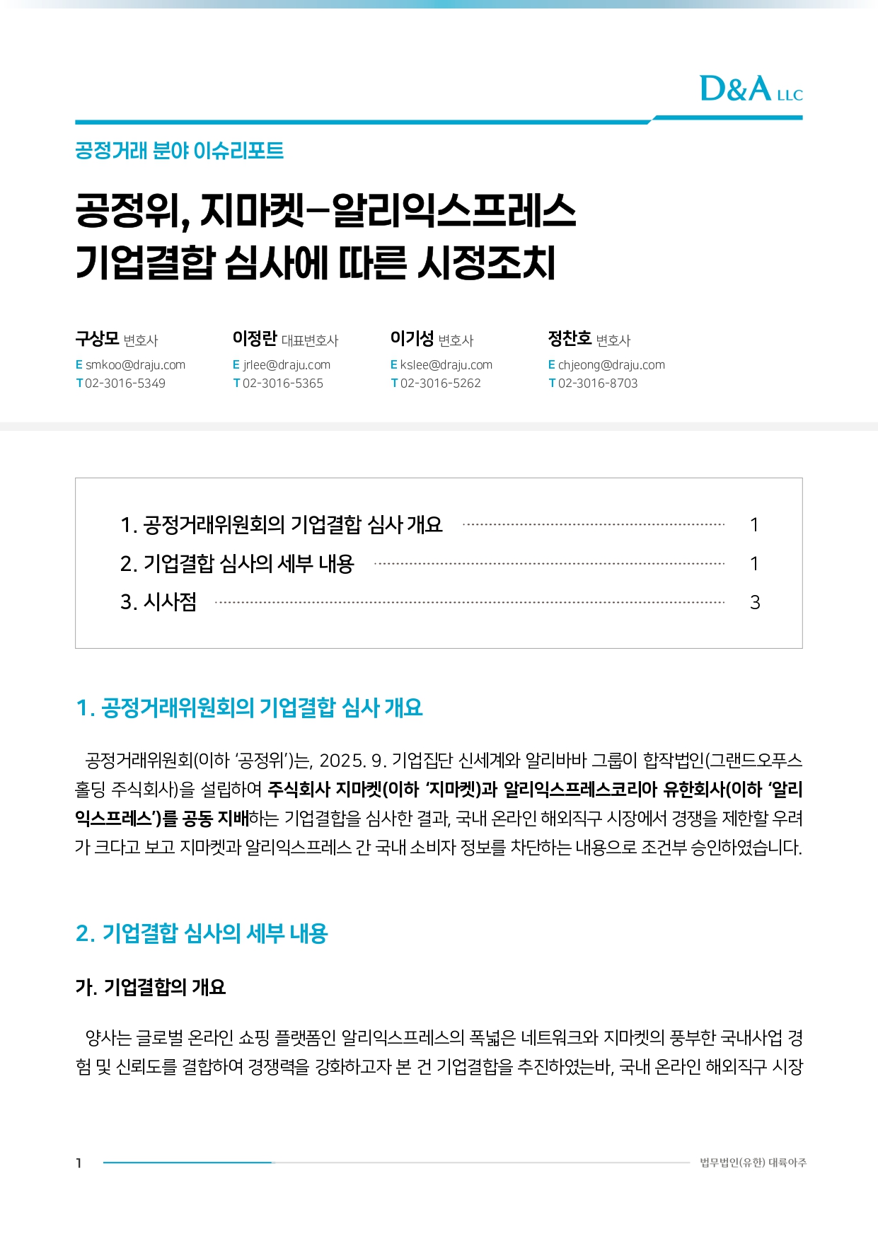 [법무법인(유한) 대륙아주] 공정거래 분야 이슈리포트 - 공정위, 지마켓–알리익스프레스 기업결합 심사에 따른 시정조치
