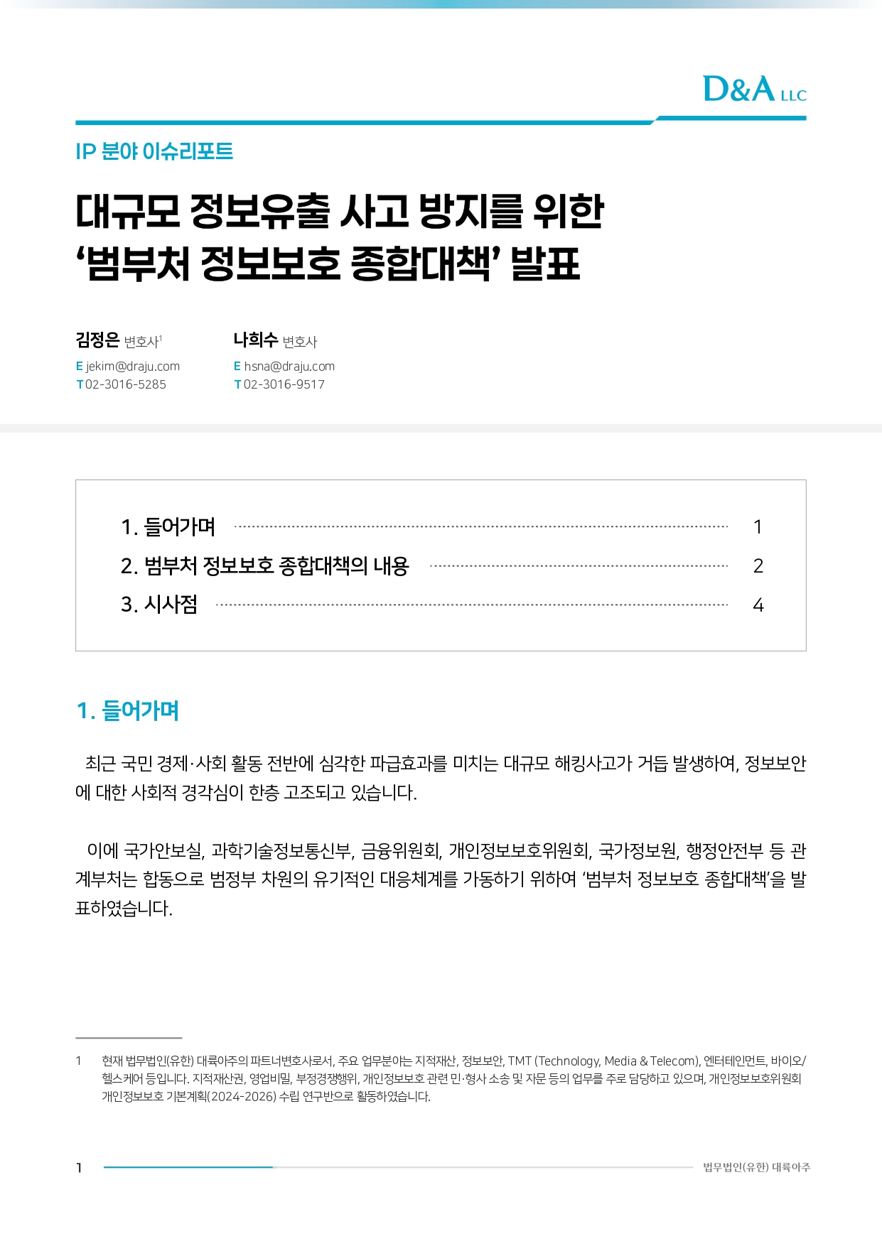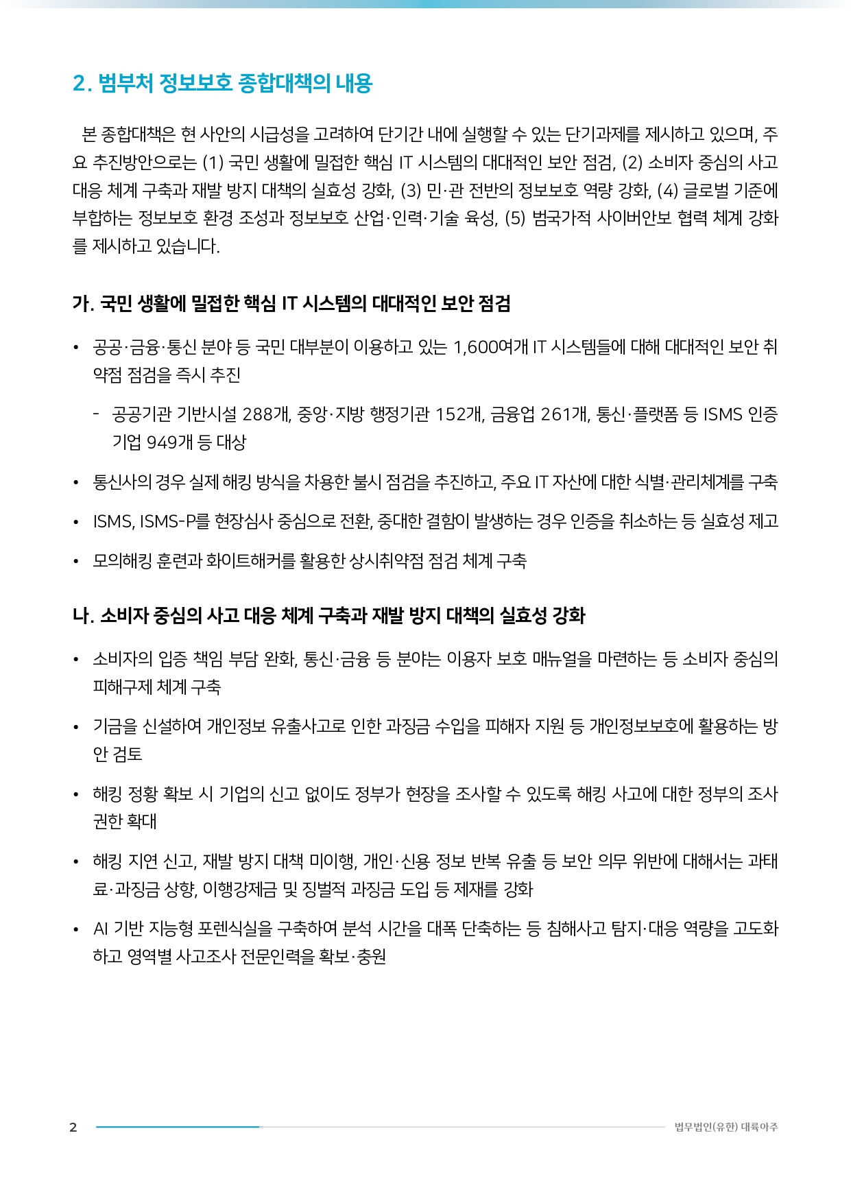 [법무법인(유한) 대륙아주] IP 분야 이슈리포트 - 대규모 정보유출 사고 방지를 위한 ‘범부처 정보보호 종합대책’ 발표