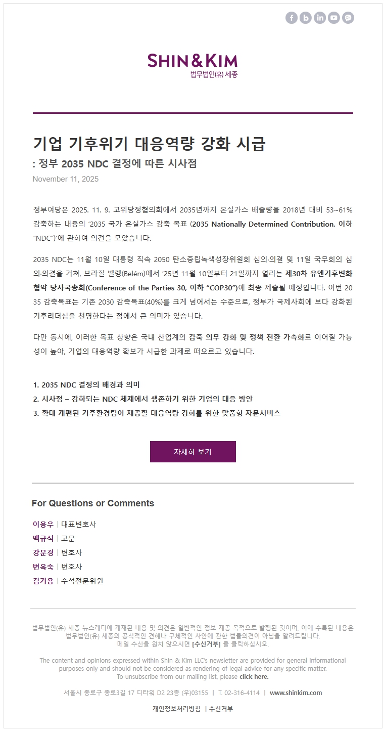 [법무법인(유) 세종] 기업 기후위기 대응역량 강화 시급 : 정부 2035 NDC 결정에 따른 시사점