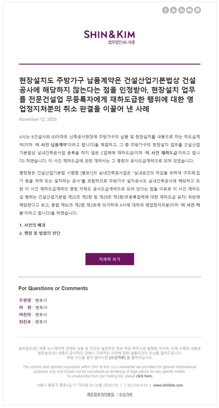 [법무법인(유) 세종] 현장설치도 주방가구 납품계약은 건설산업기본법상 건설공사에 해당하지 않는다는 점을 인정받아, 현장설치 업무를 전문건설업 무등록자에게 재하도급한 행위에 대한 영