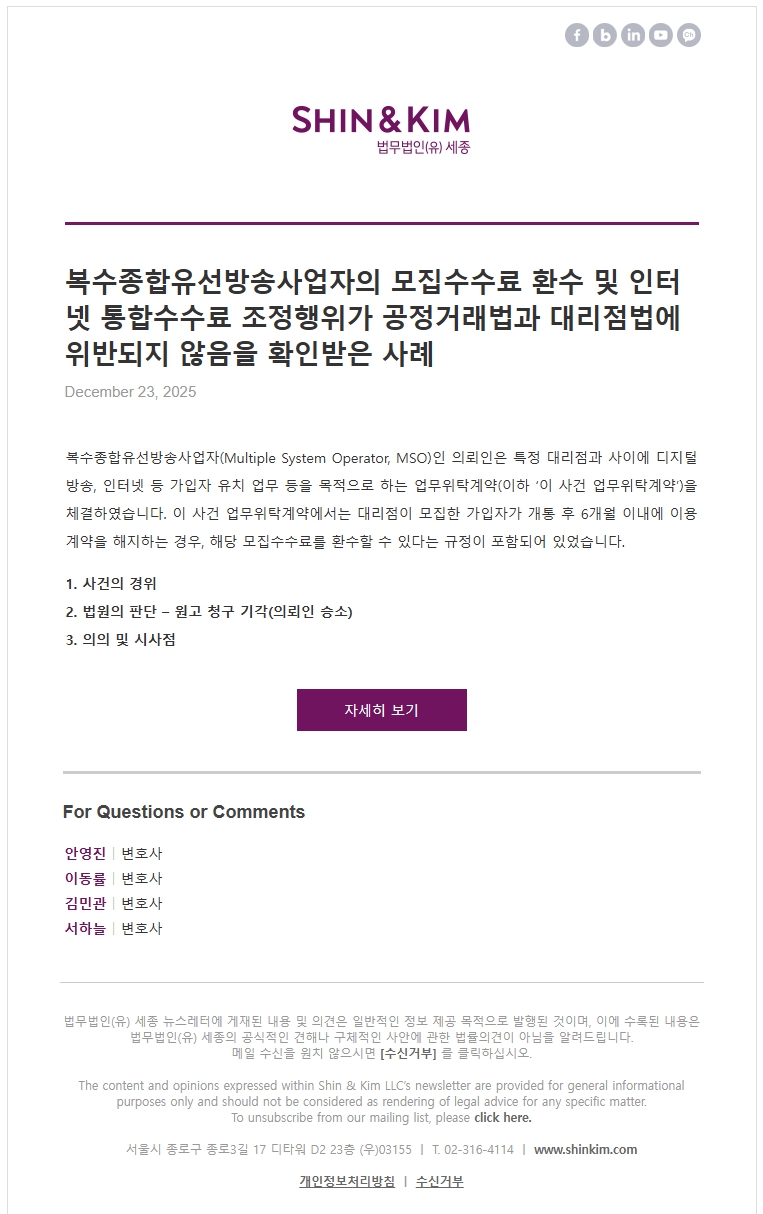 [법무법인(유) 세종] 복수종합유선방송사업자의 모집수수료 환수 및 인터넷 통합수수료 조정행위가 공정거래법과 대리점법에 위반되지 않음을 확인받은 사례