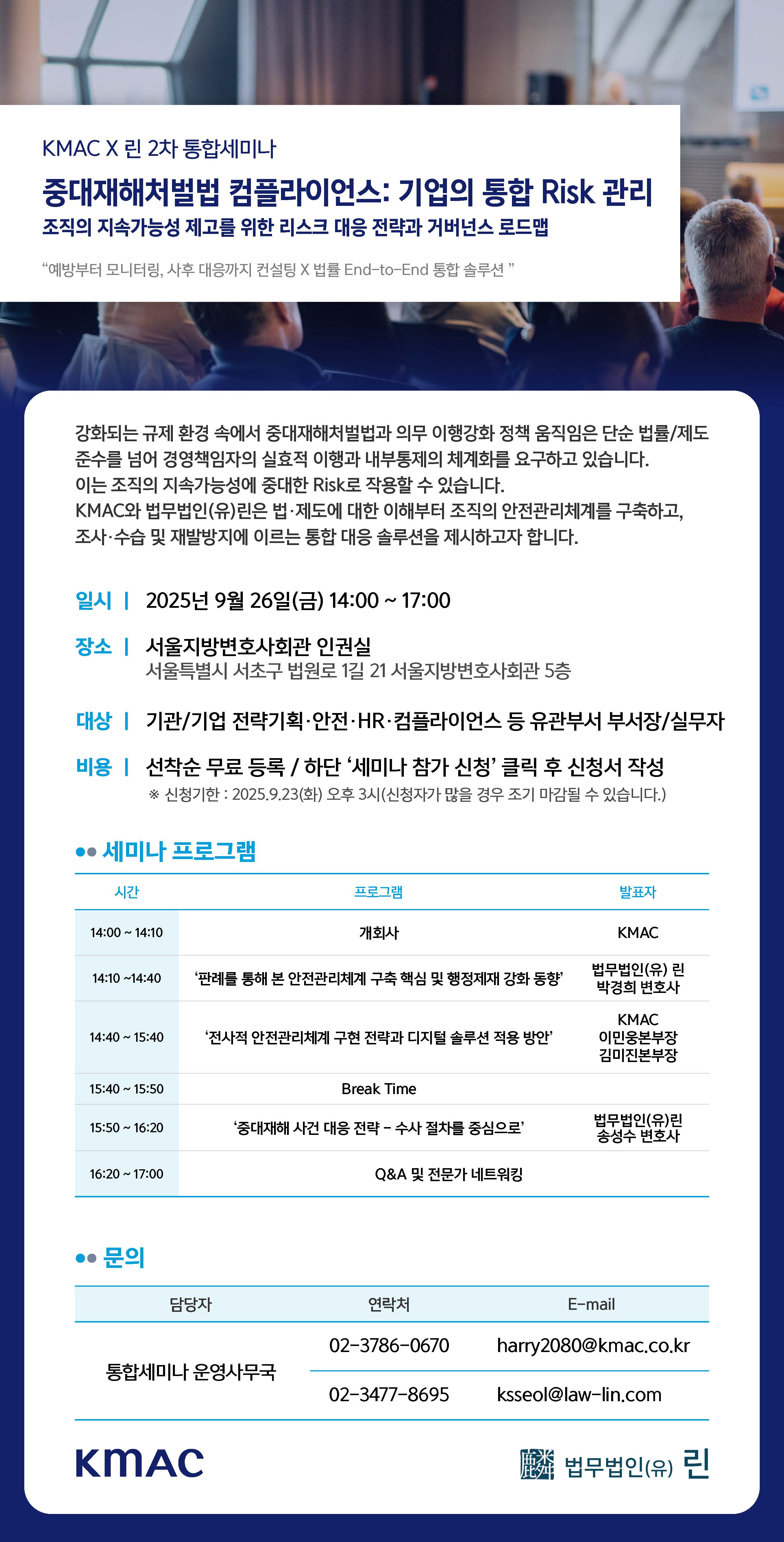 [법무법인(유) 린 X KMAC 2차 통합 세미나] 중대재해처벌법 컴플라이언스: 기업의 통합 Risk 관리 - 조직의 지속가능성 제고를 위한 리스크 대응 전략과 거버넌스 로드맵_9/26(금)_2:00PM_서울지방변호사회관 5층