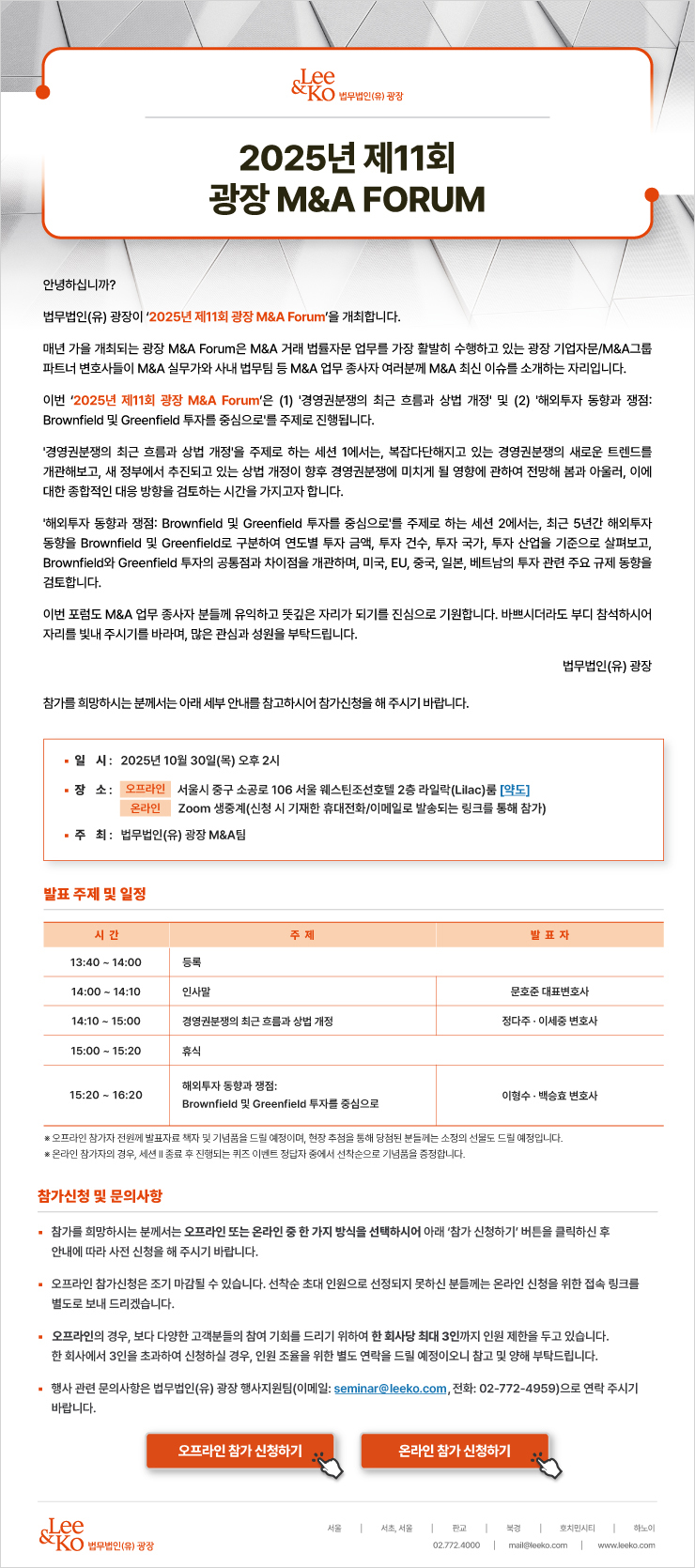 [법무법인(유) 광장] 2025년 제11회 광장 M&A Forum_10/30(목)_2PM_웨스틴조선호텔 2층 라일락룸(온오프라인 동시)