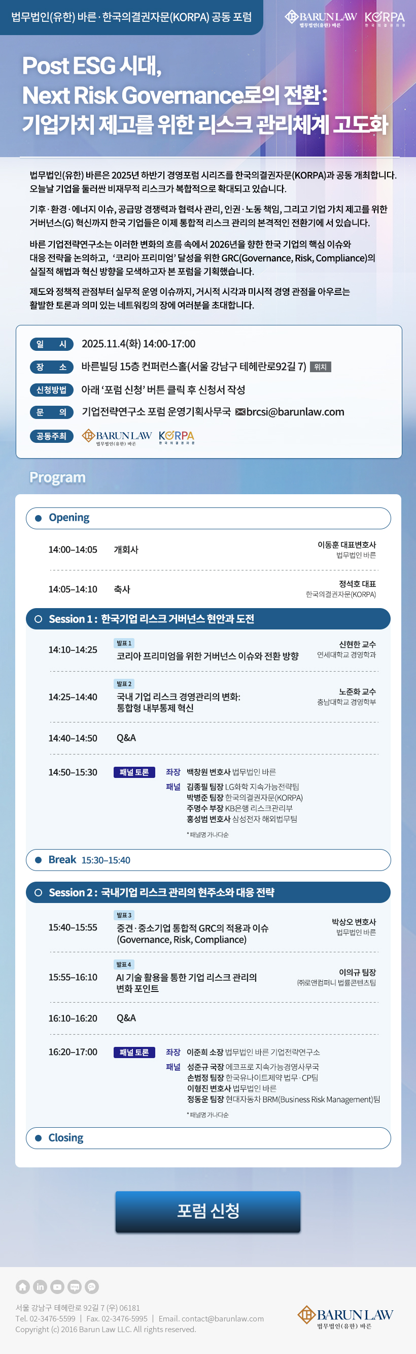 [법무법인(유한) 바른] 제 1회 법무법인 바른 경영 포럼 시리즈_11/4(화)_2PM_바른빌딩 15층 컨퍼런스홀
