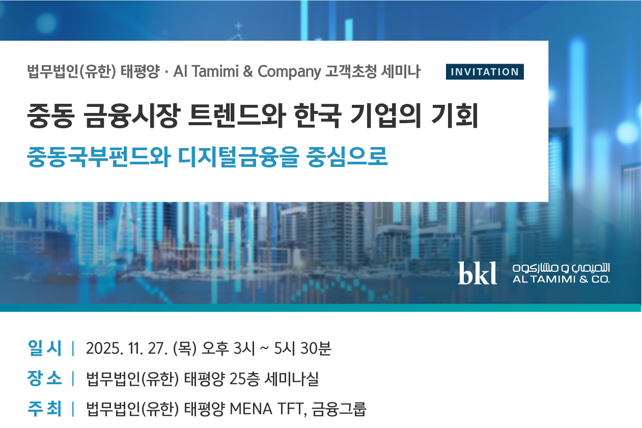 글로벌 금융 환경의 변화와 중동 금융시장에 대한 관심이 높아지는 지금, 중동 지역의 최대 로펌인 Al Tamimi & Company와의 공동 세미나를 통해 중동 현지의 금융시장에 대한 생생한 인사이트와 실무적 노하우를 공유하고자 합니다. 본 세미나는 중동 금융시장 진출을 모색하는 기업 및 기관에 실질적인 전략과 유익한 정보를 제공하는 뜻깊은 자리가 될 것으로 기대합니다. 많은 관심과 참여를 부탁드립니다.