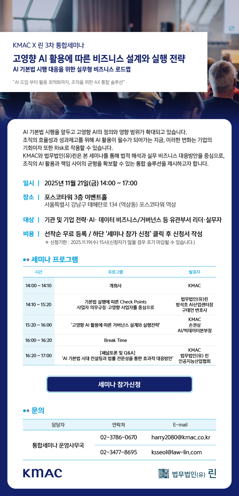 [법무법인(유) 린 X KMAC 3차 통합 세미나] 고영향 AI활용에 따른 비즈니스 설계와 실행 전략 - AI 기본법 시행 대응을 위한 실무형 비즈니스 로드맵