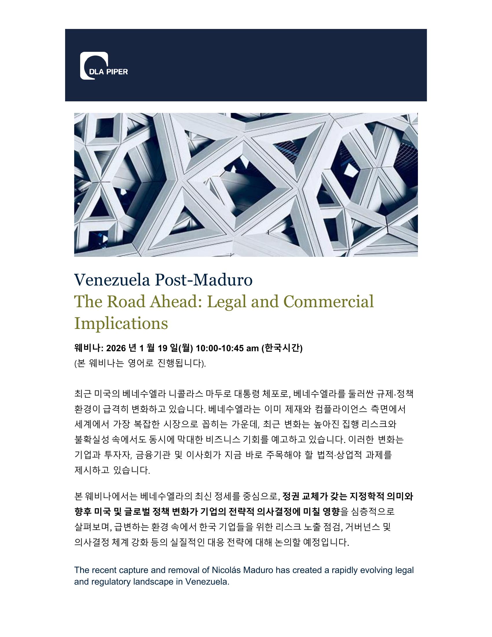 [DLA Piper 웨비나 초대] 마두로 이후 베네수엘라, 무엇이 달라지는가 - 법과 비즈니스의 향방_1/19(월)_10AM_온라인 세미나