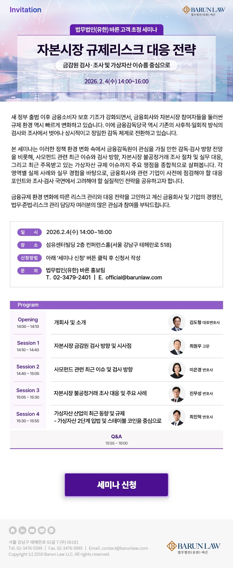 [법무법인(유한) 바른] '자본시장 규제리스크 대응 전략’ 세미나 - 2/4(수) 오후 2시_섬유센터빌딩 2층 컨퍼런스홀