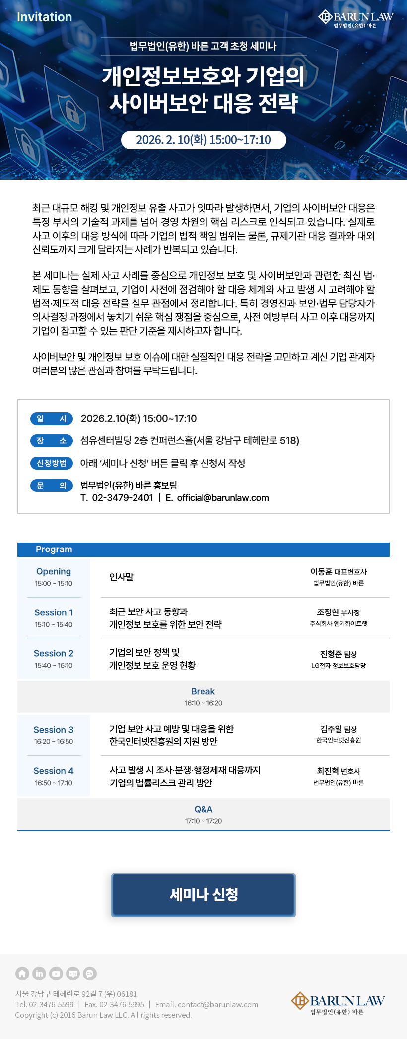 [법무법인(유한) 바른] '개인정보보호와 기업의 사이버보안 대응 전략’ 세미나 - 2/10(화) 오후 3시_섬유센터빌딩 2층 컨퍼런스홀