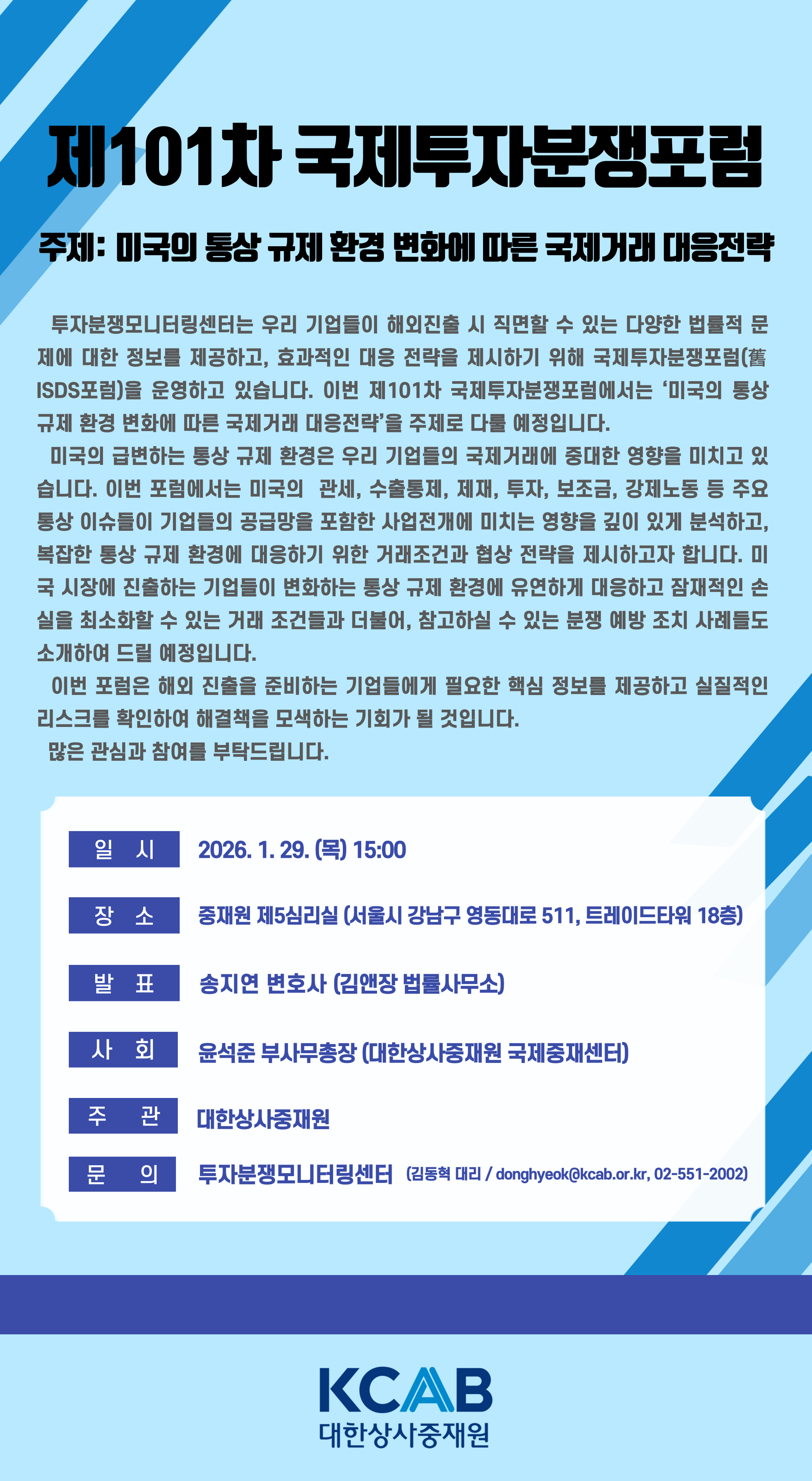 [대한상사중재원] 제101차 국제투자분쟁포럼(舊 ISDS포럼)_1/29(목)_3PM_트레이드타워 18층 제5심리실