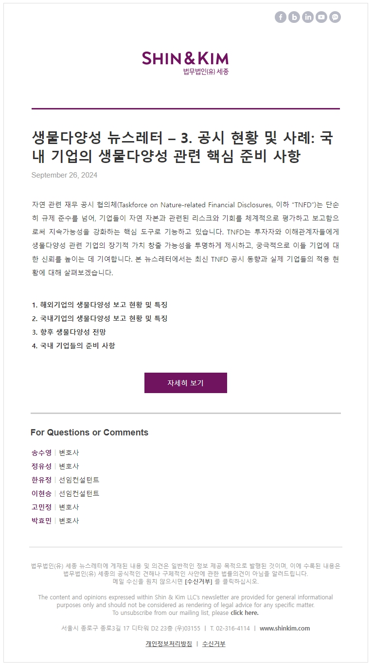 [법무법인(유) 세종] 생물다양성 뉴스레터 – 3. TNFD 공시 현황 및 사례: 국내 기업의 생물다양성 관련 핵심 준비 사항
