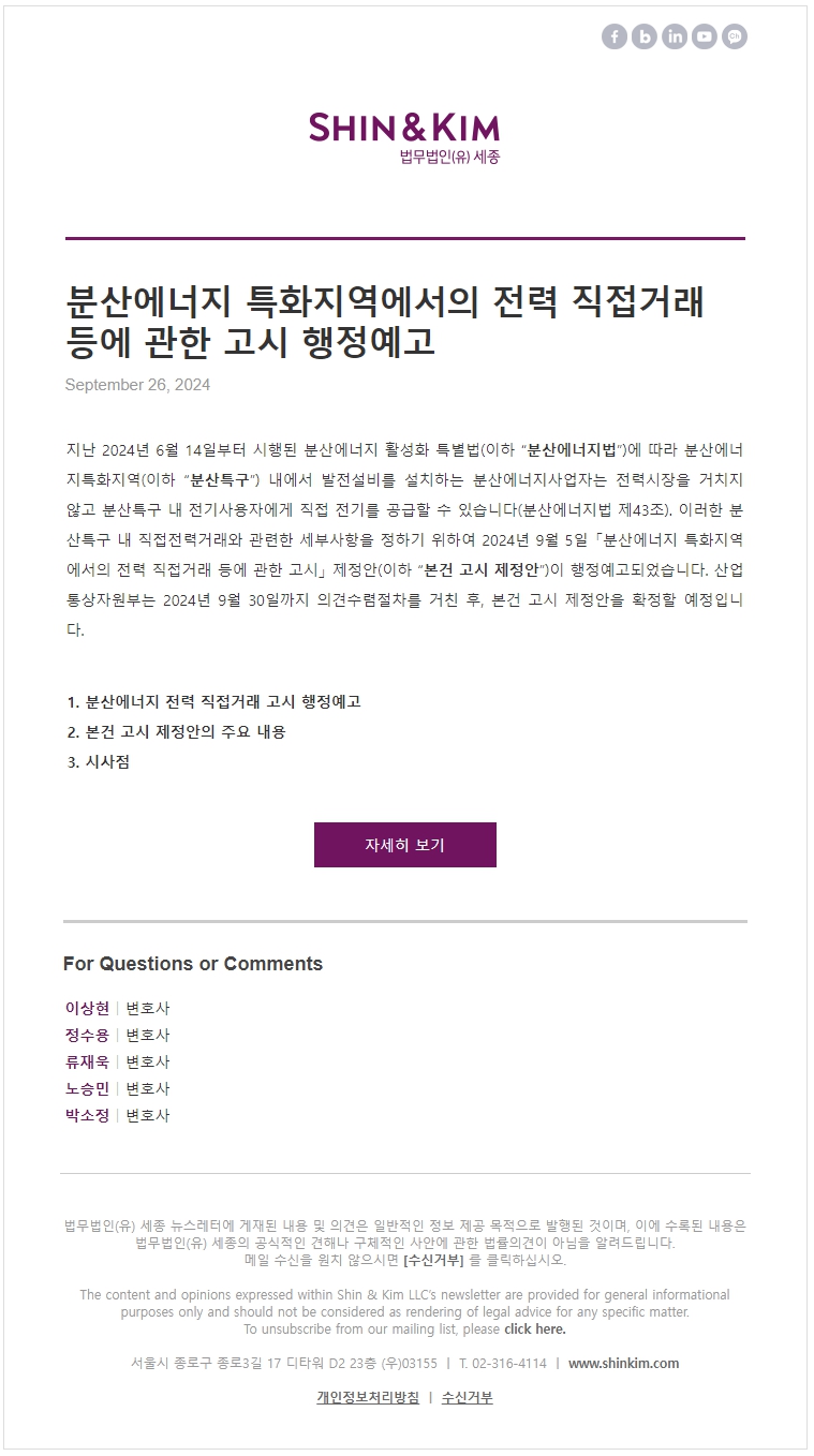 [법무법인(유) 세종] 분산에너지 특화지역에서의 전력 직접거래 등에 관한 고시 행정예고