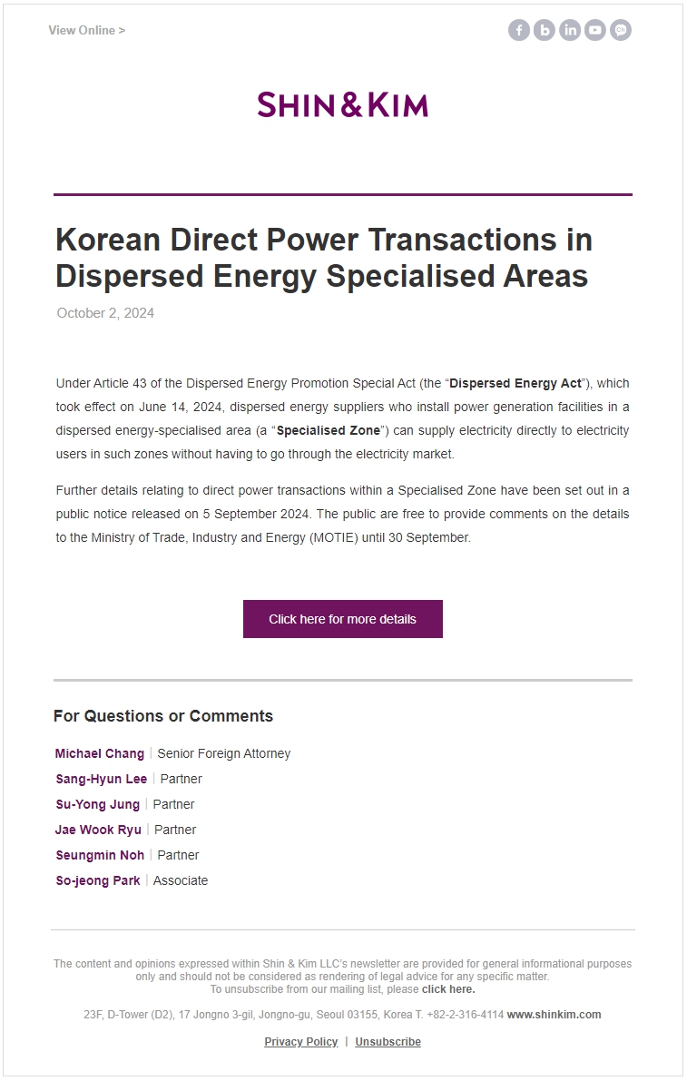 [법무법인(유) 세종] Korean Direct Power Transactions in Dispersed Energy Specialised Areas