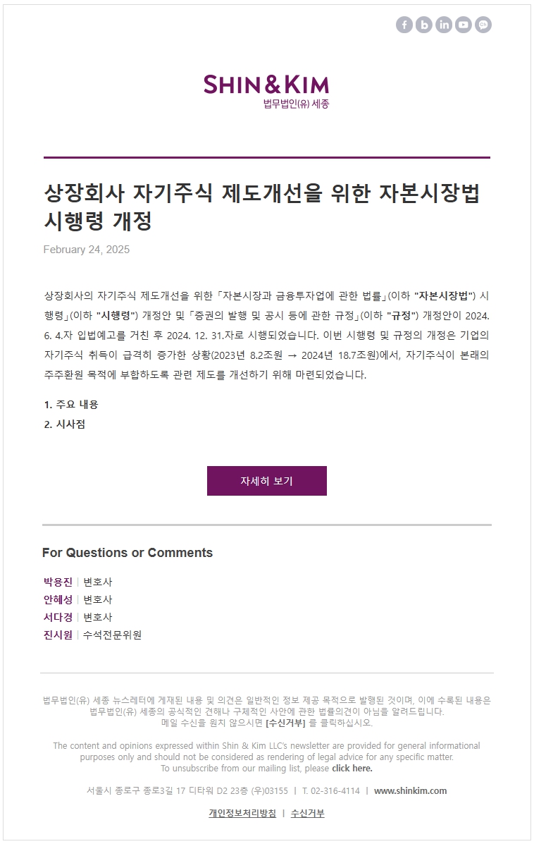 [법무법인(유) 세종] 상장회사 자기주식 제도개선을 위한 자본시장법 시행령 개정