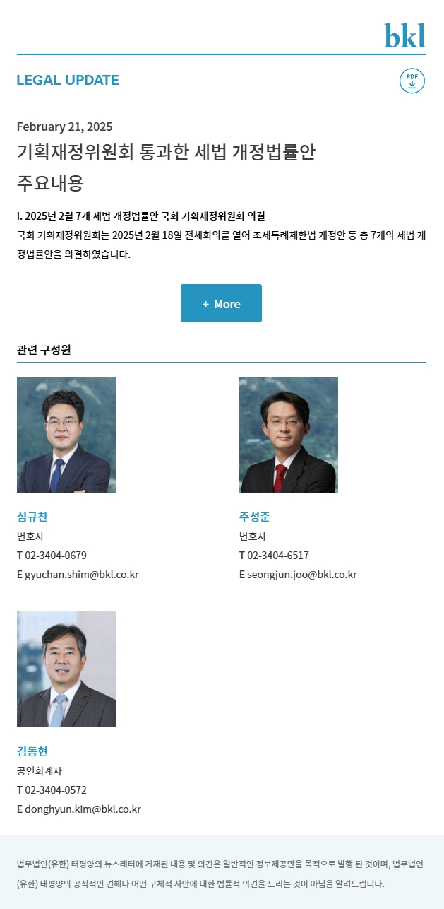 [법무법인(유한) 태평양] 기획재정위원회 통과한 세법 개정법률안 주요내용