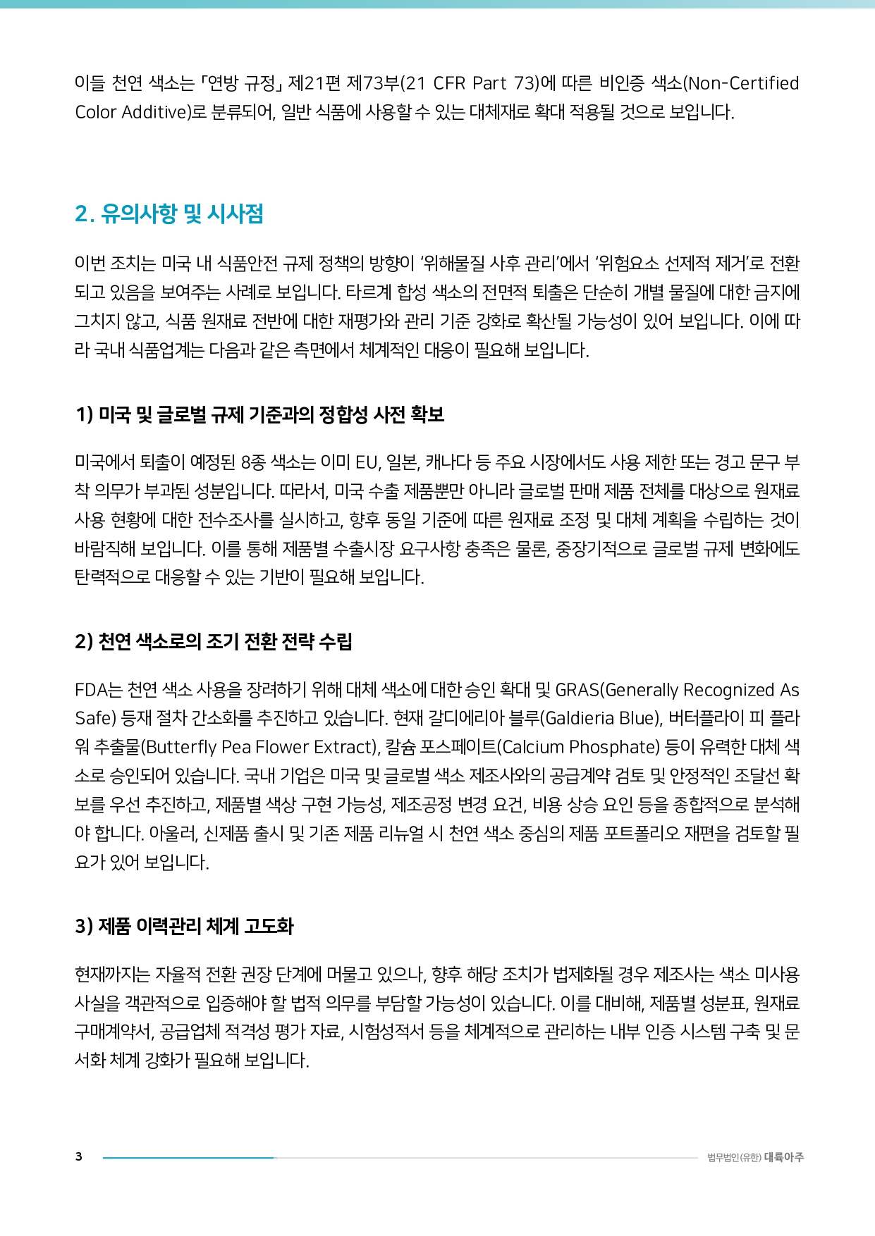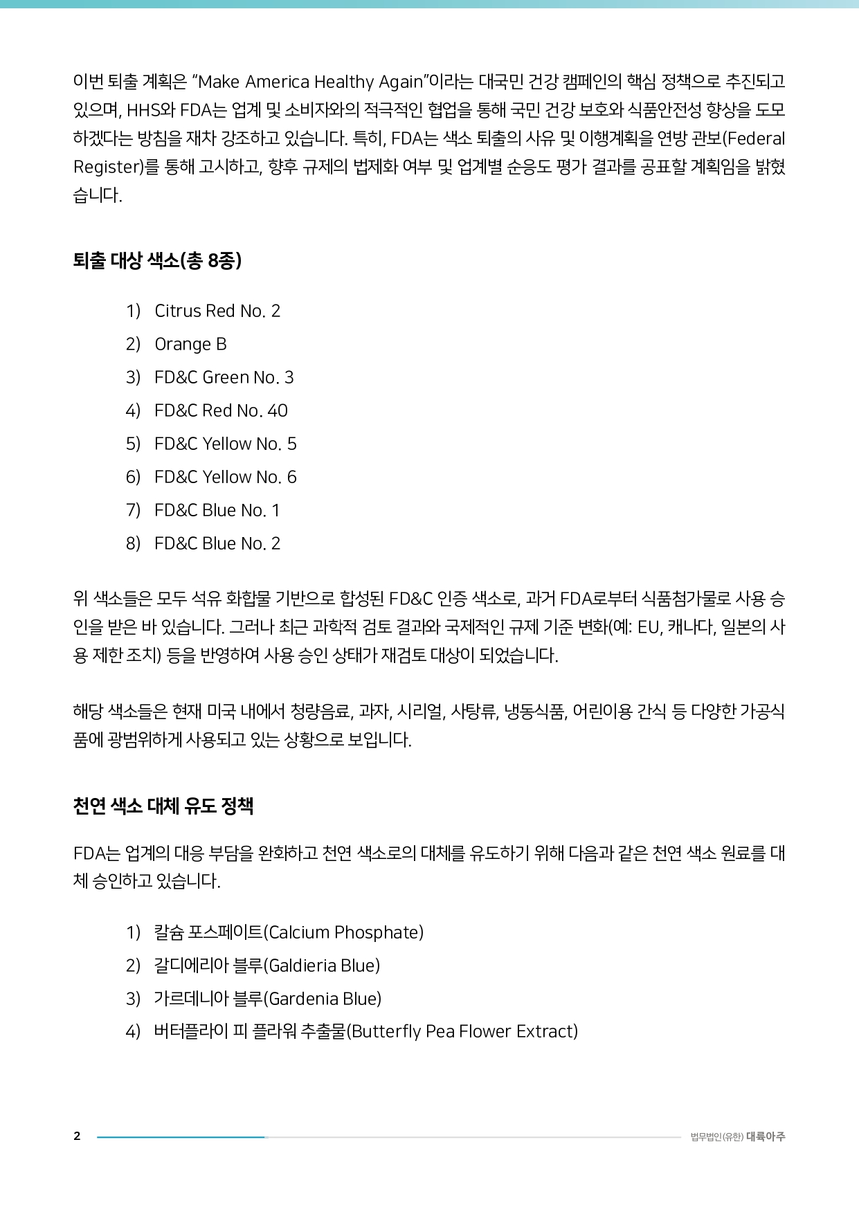 [법무법인(유한) 대륙아주] 해외규제리포트 - 미국 HHS 및 FDA, 타르계 색소 8종 단계적 퇴출 방침 발표