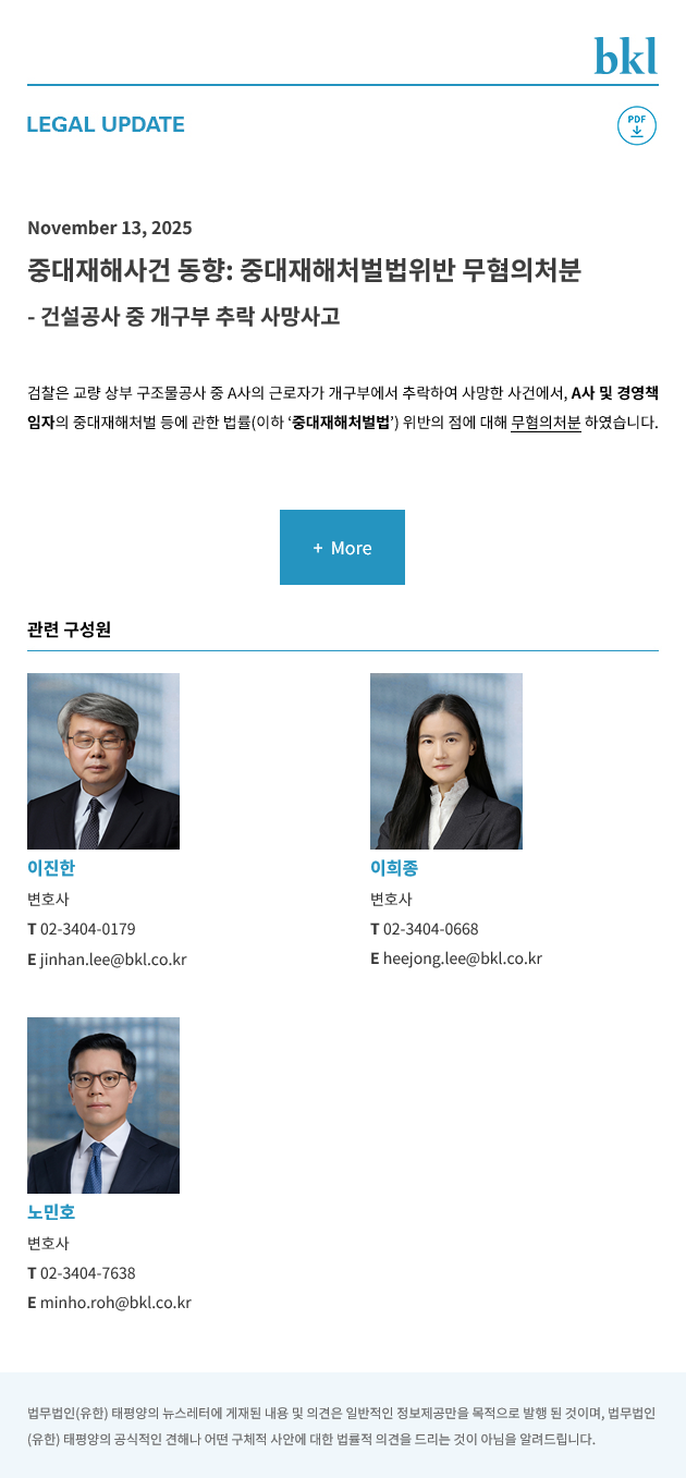 [법무법인(유한) 태평양] 중대재해사건 동향: 중대재해처벌법위반 무혐의처분