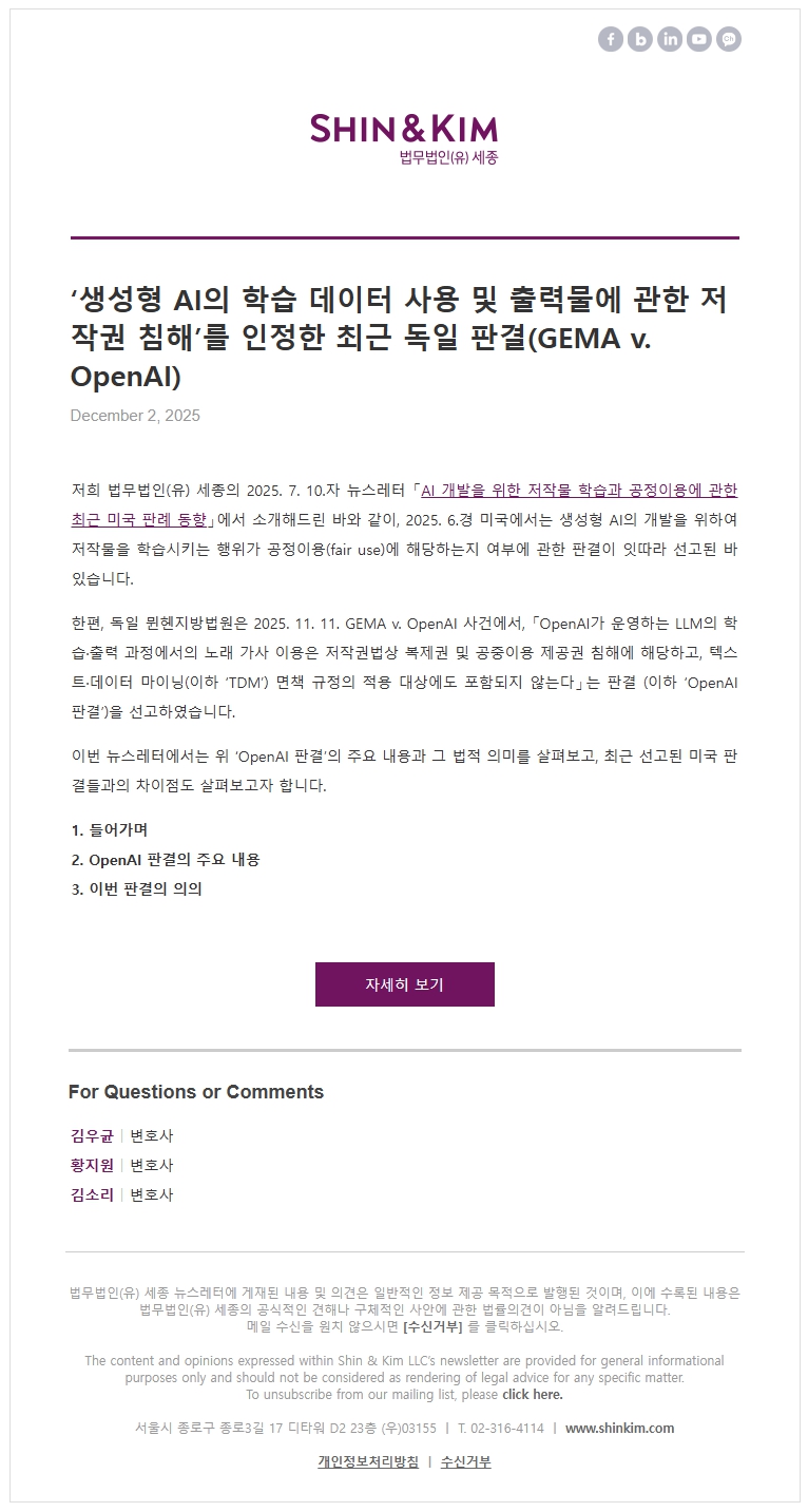 [법무법인(유) 세종] ‘생성형 AI의 학습 데이터 사용 및 출력물에 관한 저작권 침해’를 인정한 최근 독일 판결