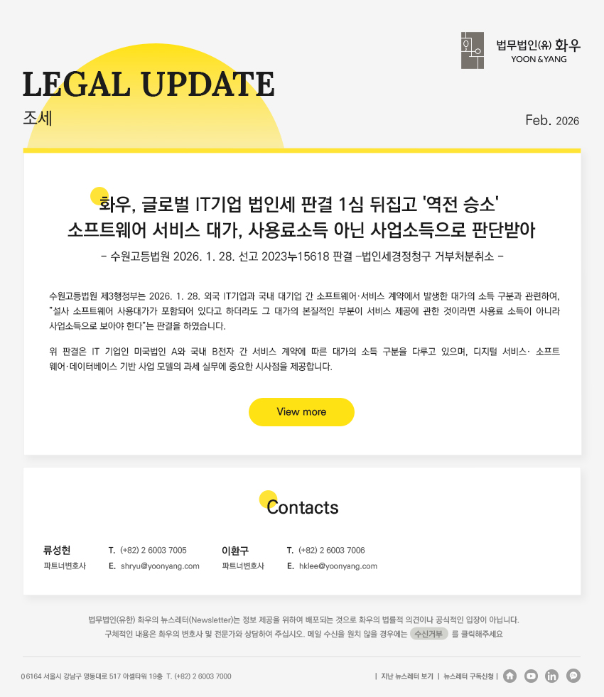 [법무법인(유한) 화우] 화우, 글로벌 IT기업 법인세 판결 1심 뒤집고 '역전 승소' 소프트웨어 서비스 대가, 사용료소득 아닌 사업소득으로 판단받아