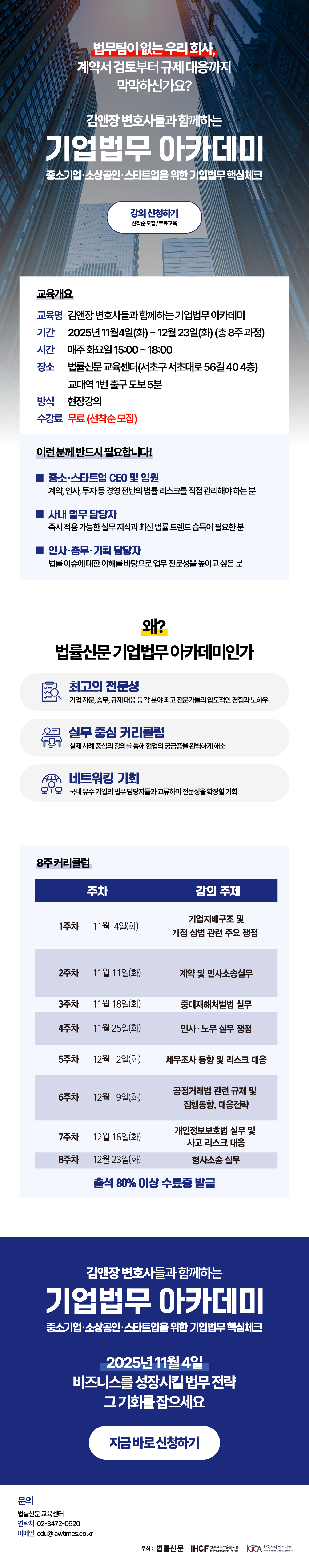 [법률신문] 김앤장 최고 법률가들과 함께하는 기업법무 아카데미_11/4(화)~12/23(화)_3PM_법률신문 교육센터