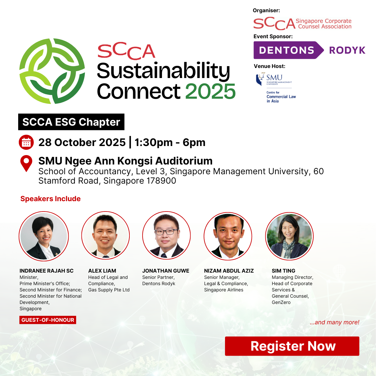 Join the Singapore Corporate Counsel Association (SCCA) in this new event series launched its ESG Chapter that brings together in-house counsels, academics and students from Singapore's law schools for meaningful dialogue and collaboration.