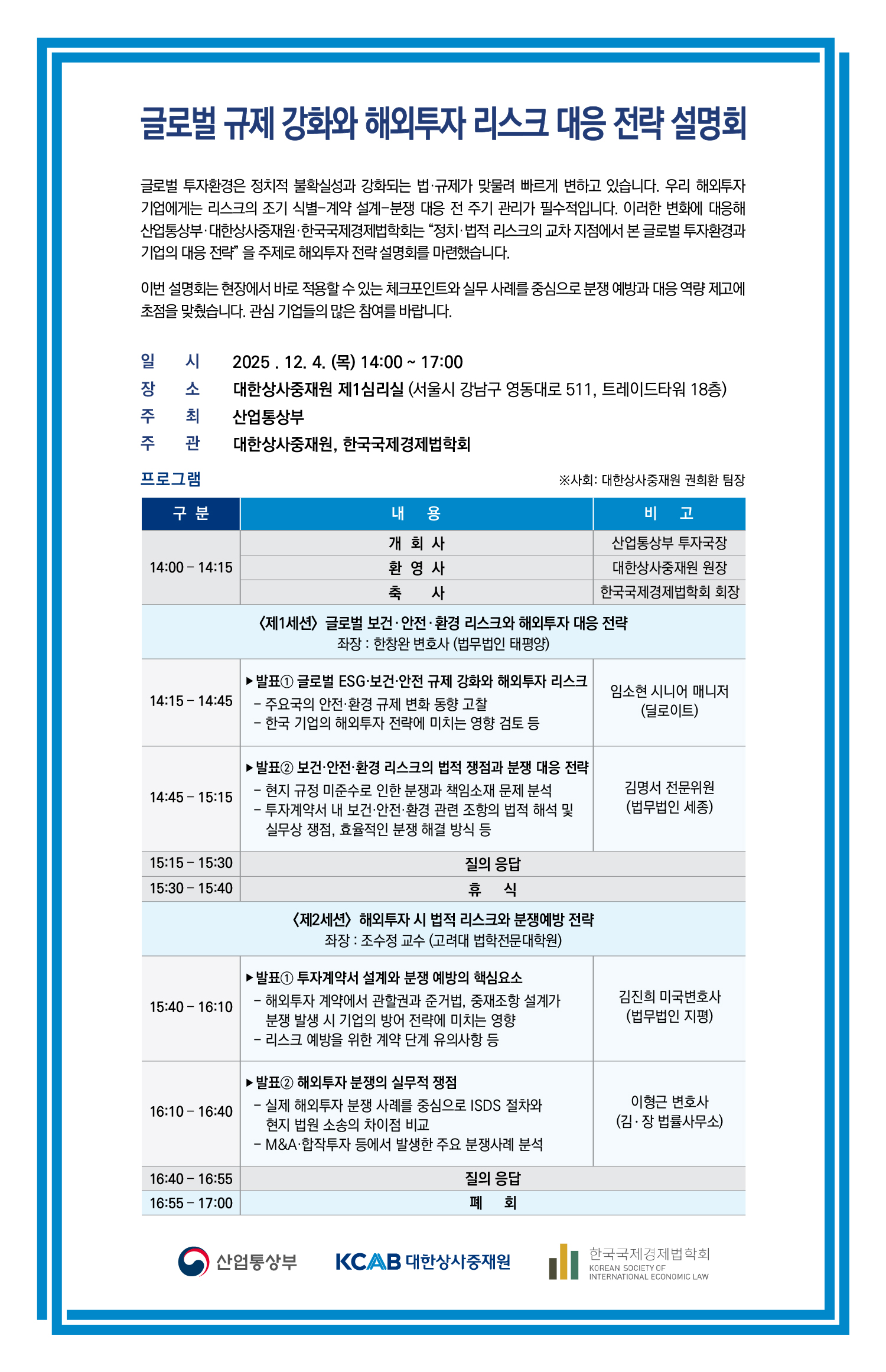 [대한상사중재원] 글로벌 규제 강화와 해외투자 리스크 대응 전략 설명회_12/4(목)_2PM_대한상사중재원 제1심리실