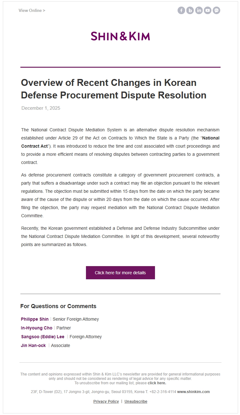 [법무법인(유) 세종] Overview of Recent Changes in Korean Defense Procurement Dispute Resolution